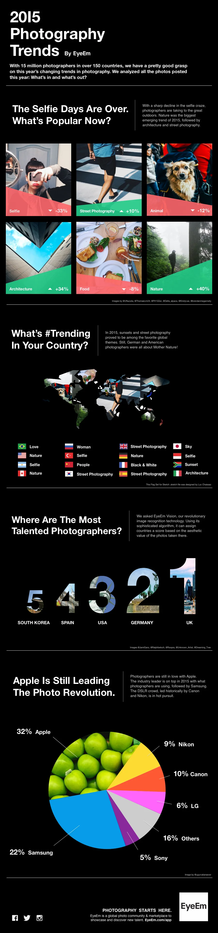 Image-sharing-and-selling site EyeEm has just released its 2015 data review, analysing everything from which were the most popular subjects by country (love in Brazil; street photography in Spain, the UK, and South Korea) to the most-used camera brand (Apple, wouldn't you know). And with 15 million users in 150 countries, there are plenty of statistics to go on.