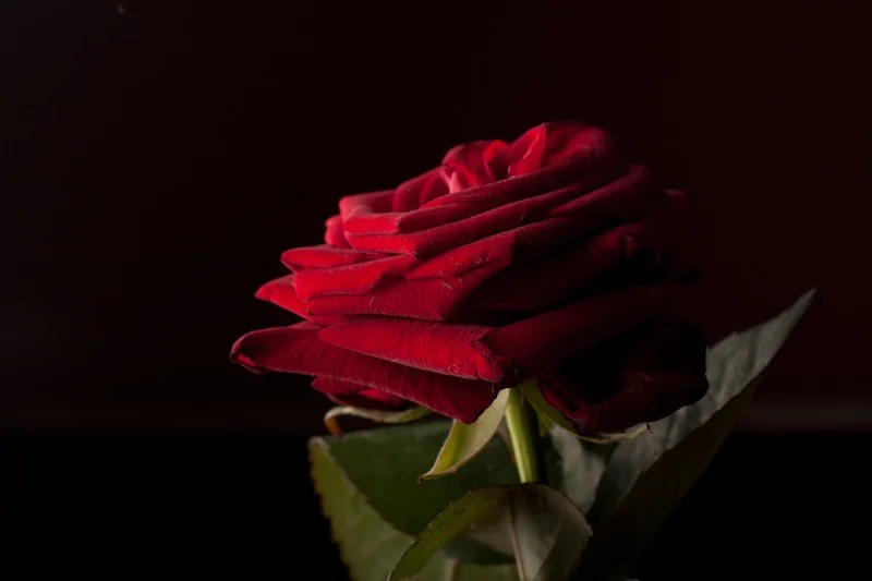 Side-lighting highlights the rose's gorgeous velvety texture