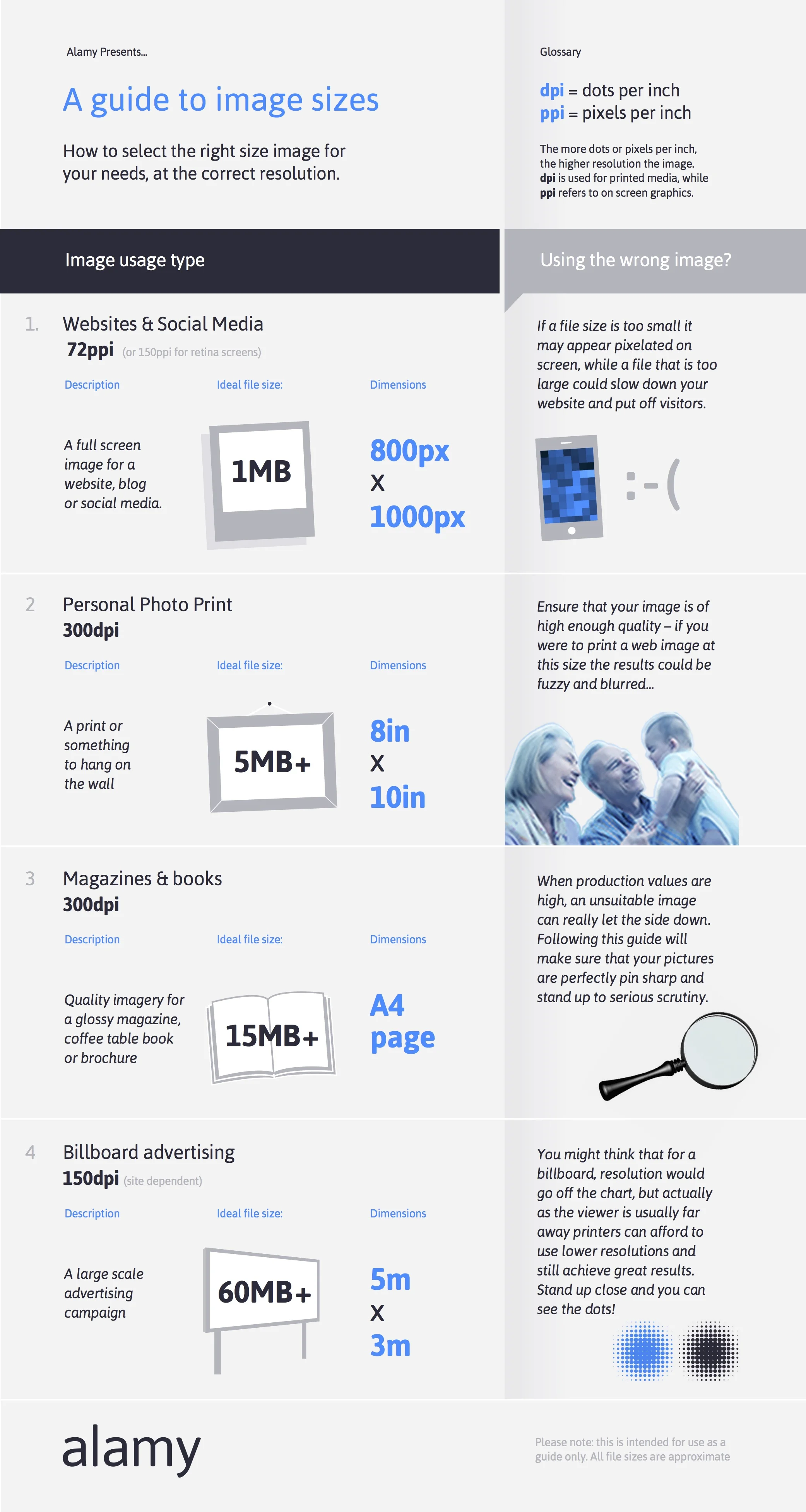 But what the article doesn't cover are image file sizes when it comes to print. Thankfully, the stock site Alamy has just the infographic for that.